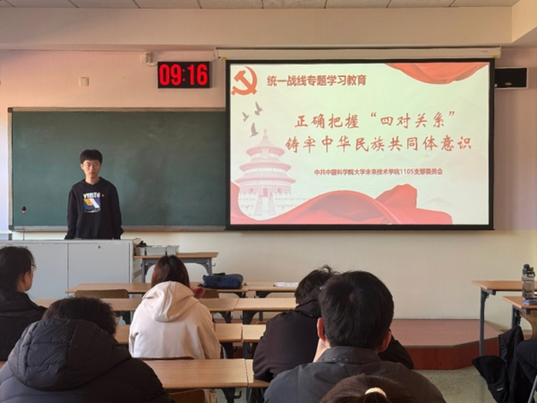 专题学习会议伊始,各支部进行了铸牢中华民族共同体意识的专题学习。1101党支部李浩月书记领学习近平总书记在中央民族工作会议上的重要讲话精神,为会议奠定了坚实的政治基调。随后,党员们共同观看了“中国人民从哪而来”系列视频,视频深刻展现了中华民族虽历经战争烽火与分裂动荡,但在经济、政治层面始终保持着的强大的内聚力将全体中国人民紧紧相连。这种根植于历史长河的强大内聚力,正是铸牢中华民族共同体意识的精神渊源,指引着全体党员与各族人民始终同心向背、共赴复兴征程。